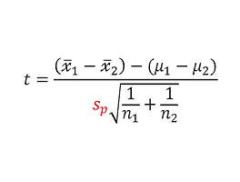 그리고 μ1-μ2는 실제의 모평균이 아니라 가설 속의 모평균이다.(귀무가설과 대립가설 속에 나오는 모평균) 그래서 오른쪽 밑에 0을 넣어서 μ0(1)-μ0(2)라고 표기하는 것이 더 정확하기는 하지만, 너무 복잡하므로 편의상 0은 생략한다. 어쨌든 가설검정에서 검정통계량을 계산할 때, μ1-μ2에는 귀무가설과 대립가설에 나오는 0을 그대로 대입하면 되는데, 가끔 문제를 응용해서 0 이외에 다른 수치를 사용하기도 한다. 그건 다음 글에서 알아보자.